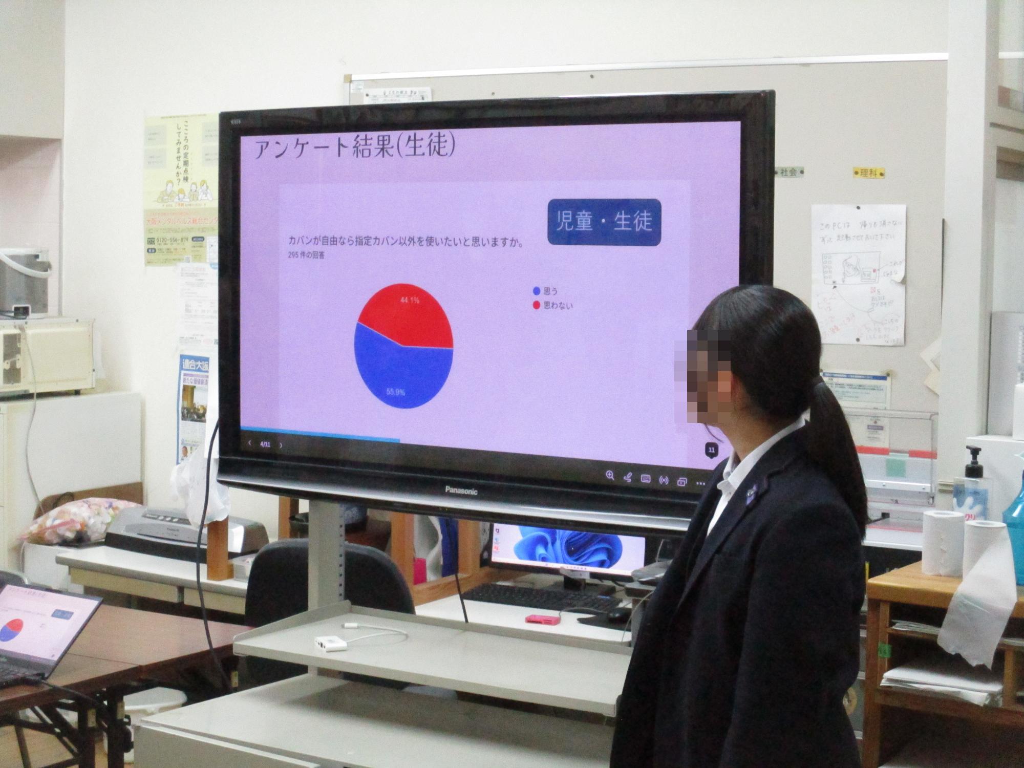 一つ目は中学生の通学バックについて。現在は指定のバックを使っていますが、これを自由にしてはどうかという提案です。良い点悪い点をそれぞれ紹介。自分たちで取ったアンケート結果も分析し、提案を行いました。