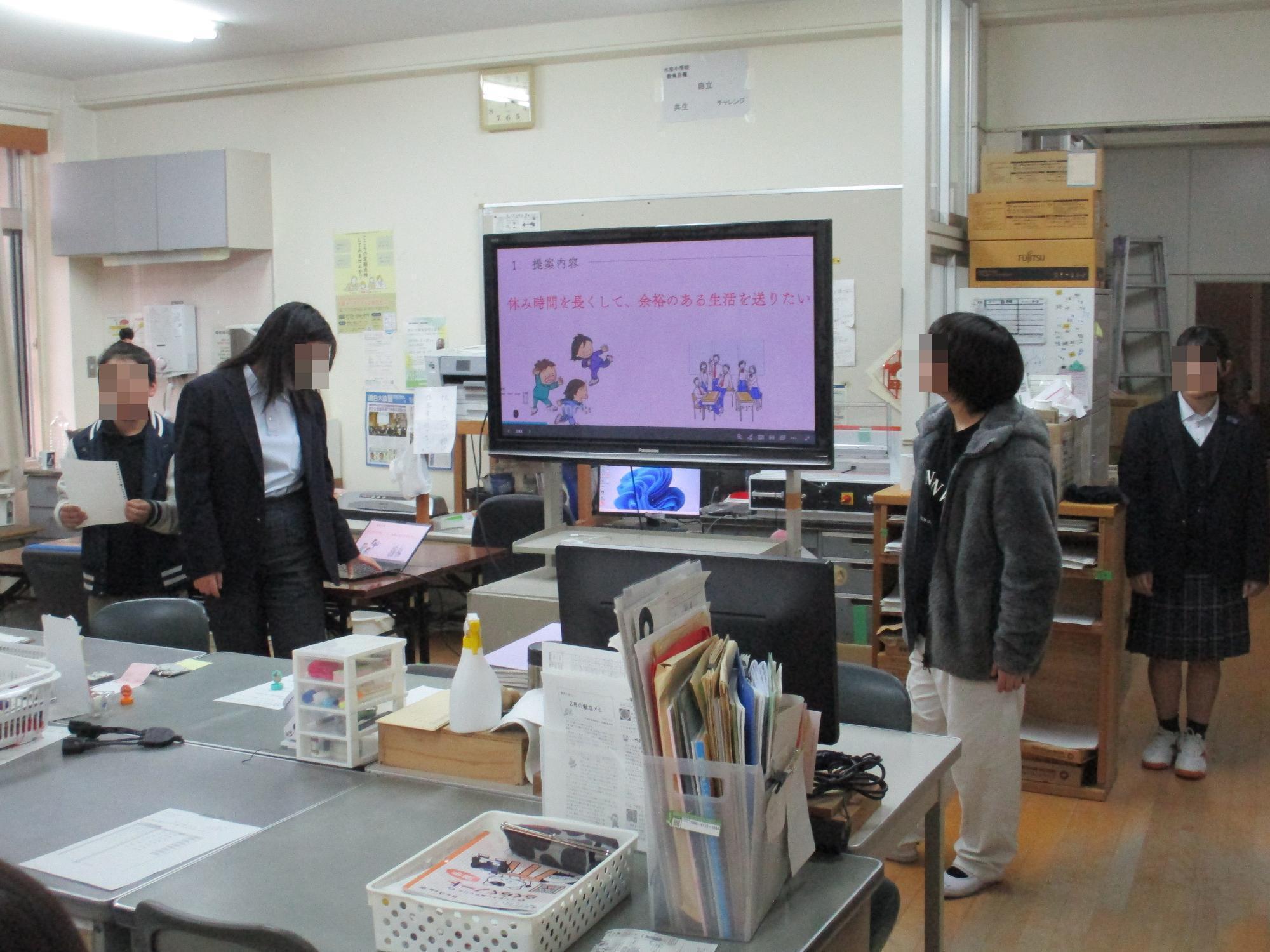 もう一つはゆとりある休み時間を過ごすための「リラックスデイ」の提案。全児童の時程をそろえて長めの休み時間を設定し、着替えや移動にゆとりを持ち、外遊びも存分に楽しめる日を設定をしませんか?という提案でした。