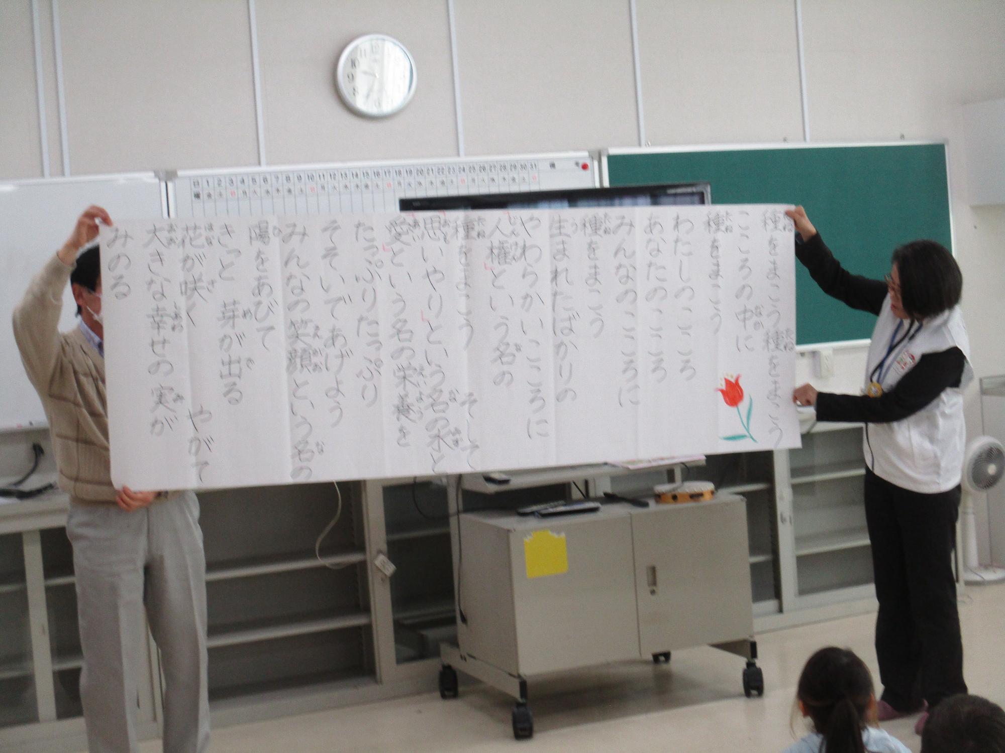 今日は前回来ていただいた増田さん、満永さんに加え会長の中道さんも来校してくださり「絵本の読み聞かせ」と、本校における「人権の花運動」の取組に対する感謝状の授与をしていただきました。一年生の子どもたちは、読み聞かせを静かに聞きながら素直な感想を言葉にし、擁護員の方も優しく対応してくださいました。