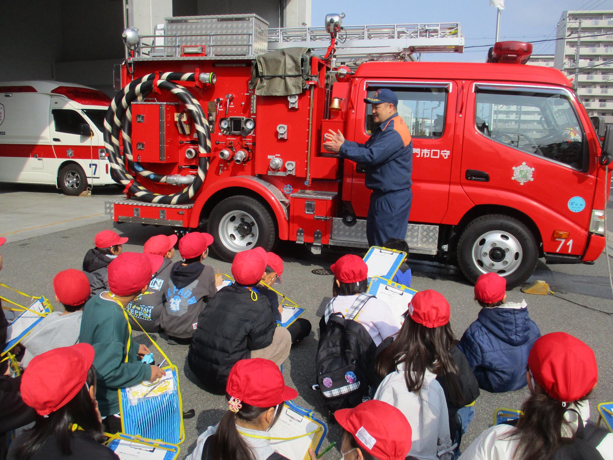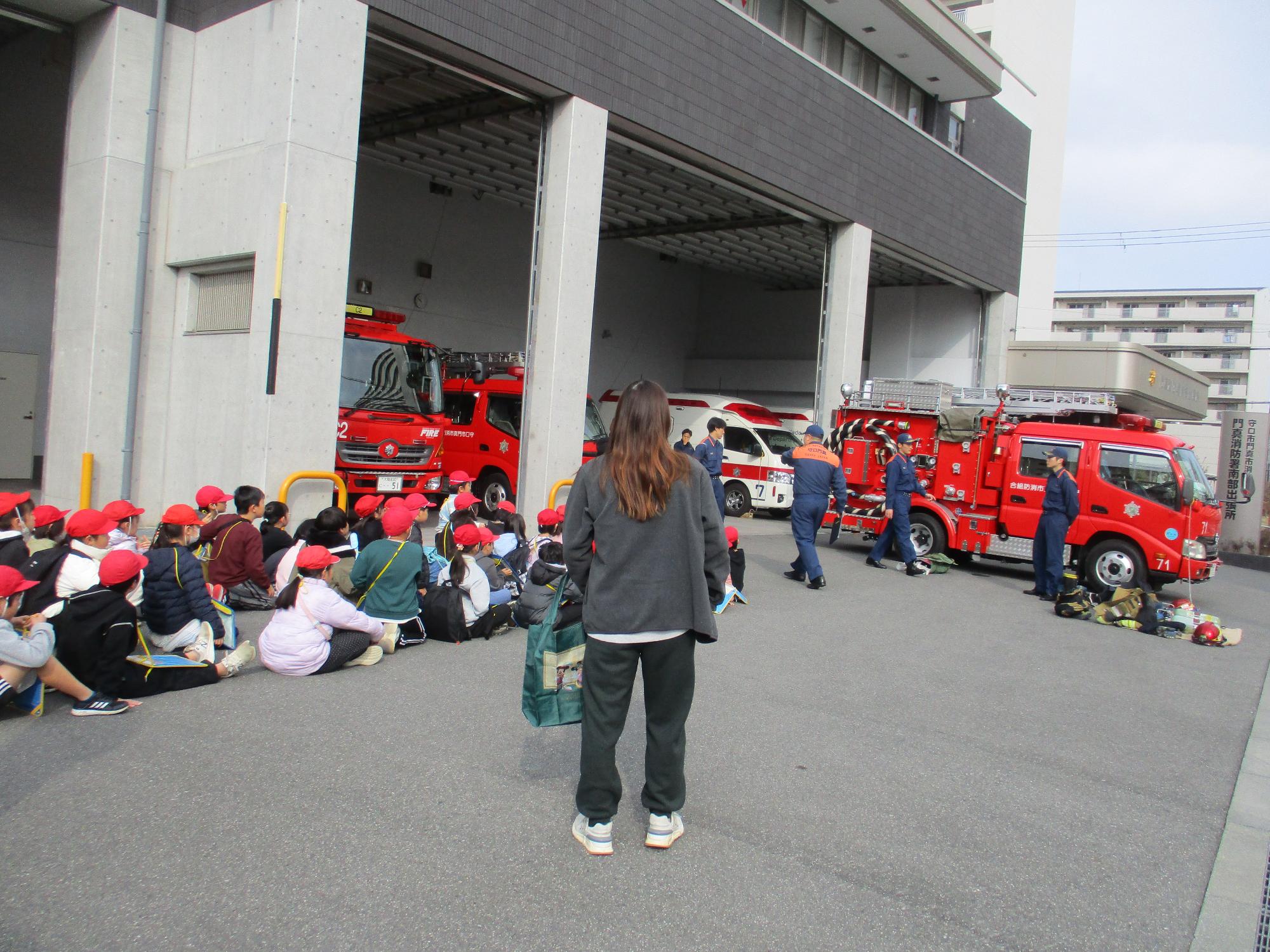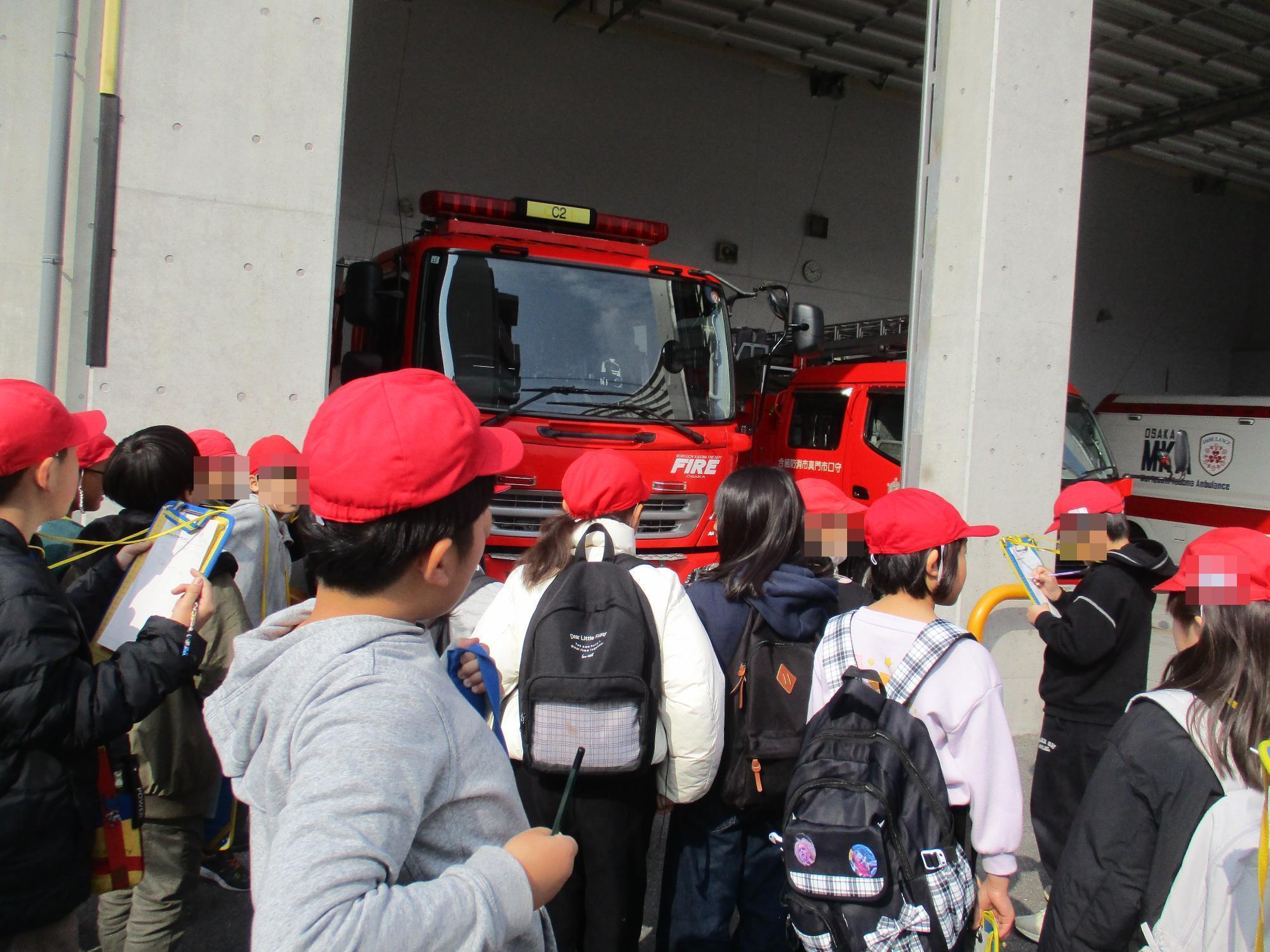 先日、三年生が消防署に社会見学に行ってきました。学校から歩いてすぐのところに「守口市門真市消防組合 門真消防署 南部出張所」があります。出張所と聞いて小さな建物のイメージを持ちますが、とても大きく立派な消防署です。各種緊急車両が待機しており、普段署の前を通ると、隊員の方々が訓練している姿もよく見かけます。