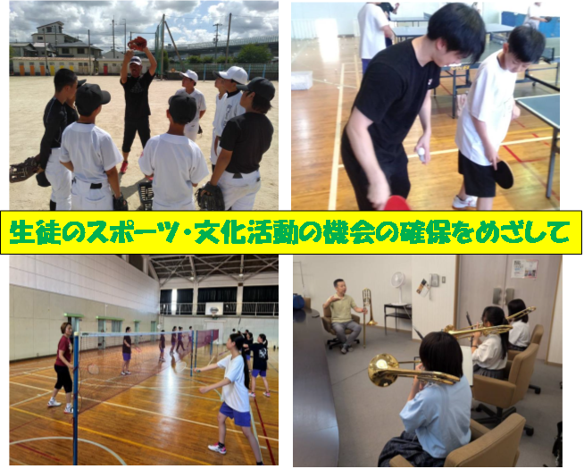 現在、「生徒のスポーツ及び文化活動の機会確保と教職員の負担軽減」を目的とし、国(文部科学省)から「中学校の部活動の地域移行」の方針が出され、各自治体等で取組が進められております。