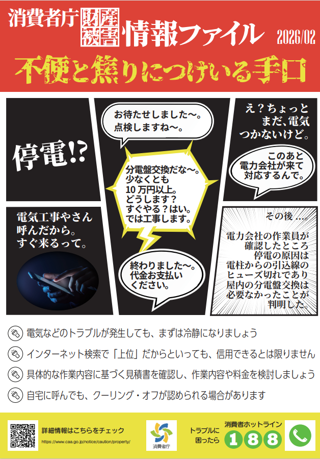 ウェブサイト上で信頼できる電気工事業者かのように表示した上、 不要な電気工事を実施し、料金を請求する電気工事業者に関する注意喚起