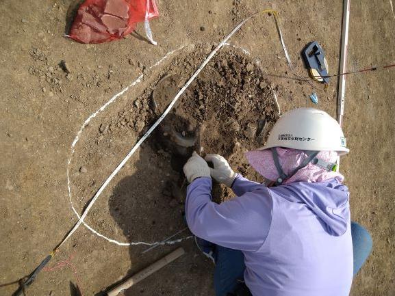 遺物包含層を掘削すると、遺構面が顔を出してきます。遺構とは地面に残された人間の生活の痕跡です。遺構の埋土は周辺の土と色や感触が微妙に違うので慎重に土を削っていくと、多くの遺構が検出されてきます。写真のように周辺と色の違う部分を石灰でマーキングして、遺構の掘削の準備を進めていきます。遺構には、溝や土坑など様々な種類がありますので、これらを検討していくと遺跡の性格が段々と明らかになっていきます。